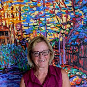 Her work has evolved over the years to her current explorations in colourful impressionistic landscapes.